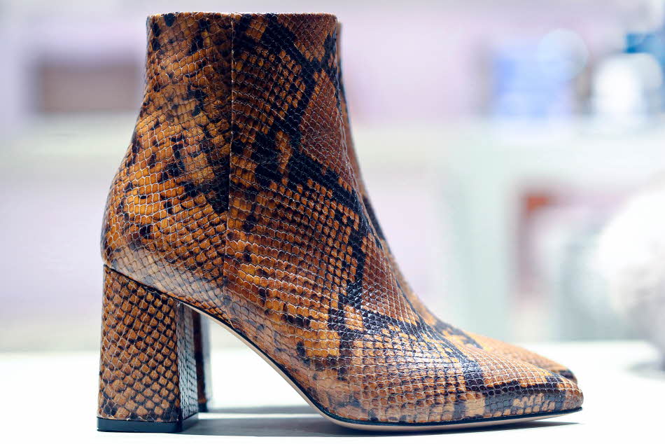 Nærbilde av støvletter i slangeskinnsmønster i brunt og sort med høy hæl.