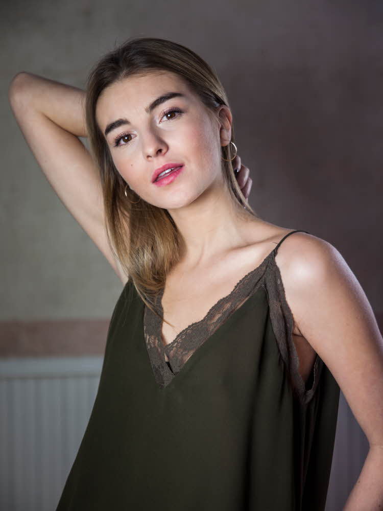 Style for eksempel en sjokoladebrun dressbukse eller et skinnskjørt med en kjole eller singlet med blondekant og en litt oversized strikkegenser over. Blondeplagget kan gjerne være i en litt lysere eller mørkere tone enn resten av antrekket for litt kontrast, eller i samme fargetone da den delikate teksturen er en kontrast i seg selv, tipser stylisten.