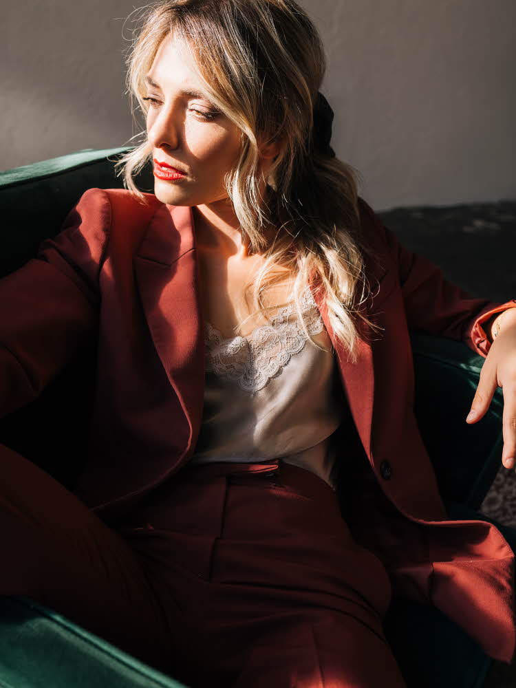 Dame med hvit blondetopp og rød bøazerjakke og dressbukse poserer i en stol med sollys som treffer ansiktet.