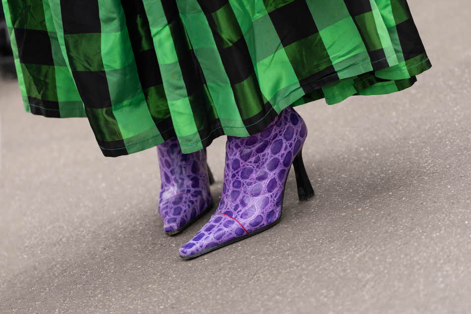 Nærbilde dameben med lilla støvletter i slangeskinnsmønster og grøntrutete skjørt.