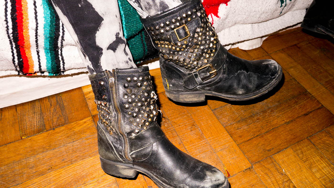 Nærbilde av sorte skinnboots med gullnagler og metallspenne med tregulv og sofa i bakgrunnen.
