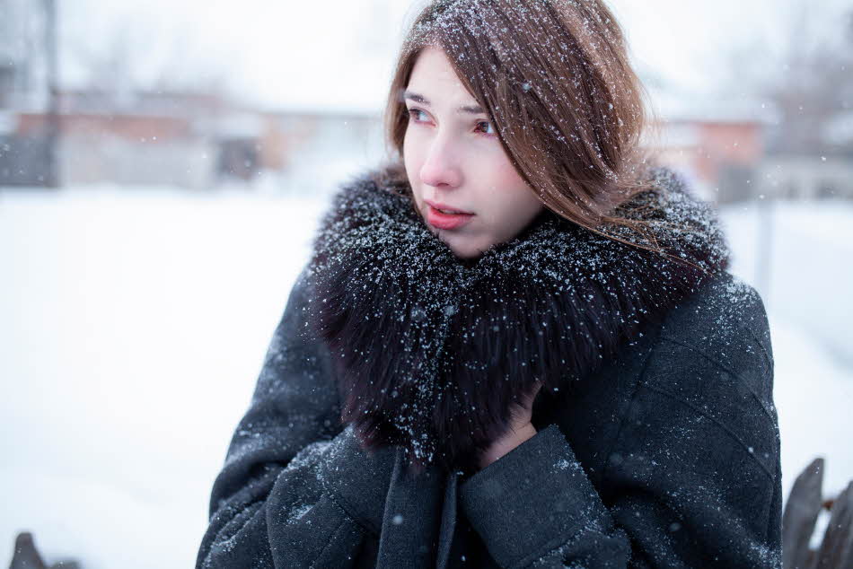 Nærbilde av dame med sort kåpe med sort fuskepelskrage som står ute i snøvær.